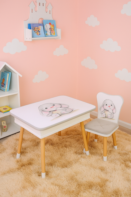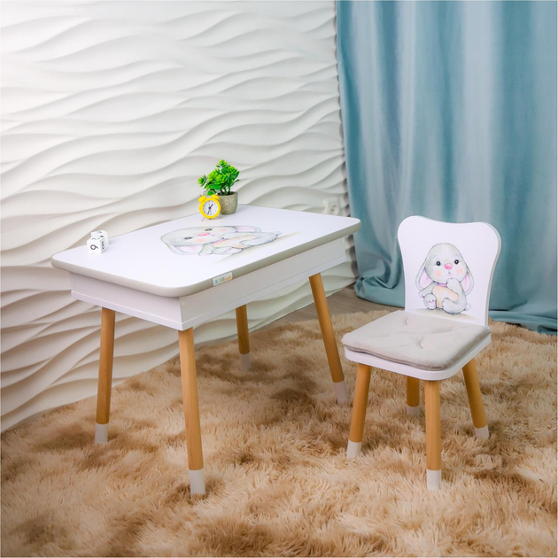 Дитячий стіл із пеналом та стільчиком 60*45*46 см дерев'яний набір для творчості з малюнком зайчика