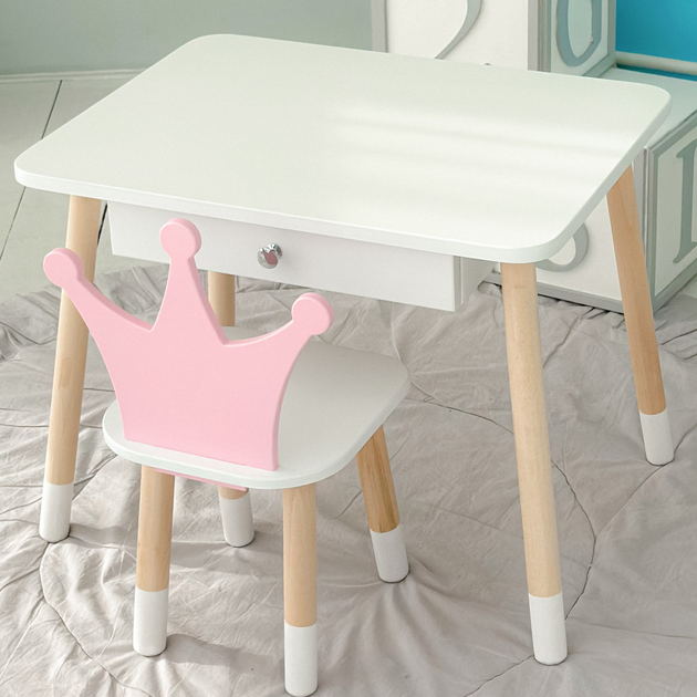 Дитячий столик білий і стільчик корона біло-рожевий. Столик із шухлядою для олівців і розмальовок 56787