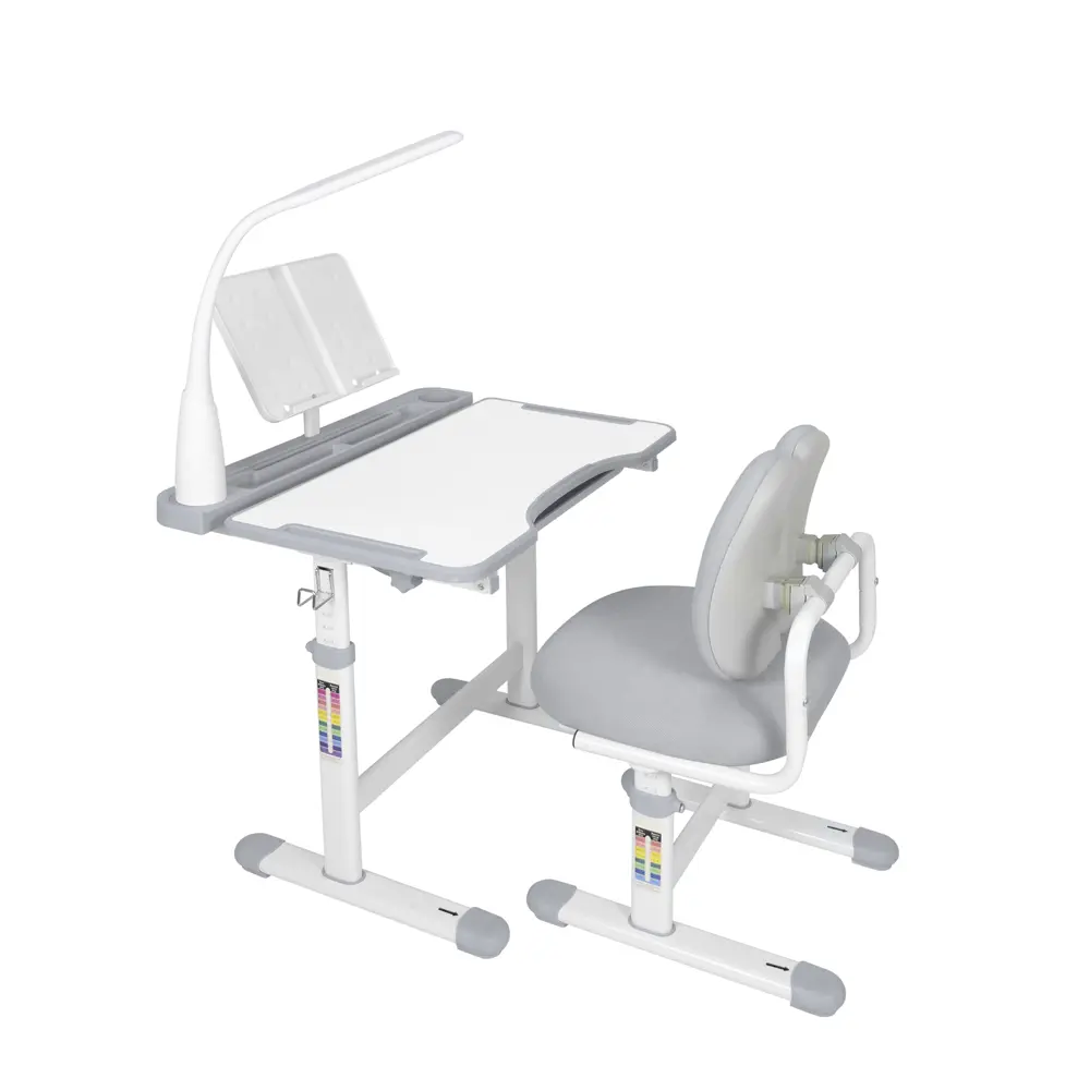 - комплект состоит из функционального столика и эргономичного стула с регулировкой высоты - столешница изготовлена из материала МДФ стандарта Е-1 - резиновый барьер предотвращает скатывание предметов во время выполнения домашнего задания - столешница изменяет угол наклона до 50 градусов - выдвижной органайзер, на столешнице есть