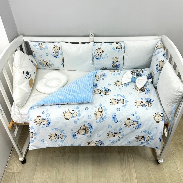 Комплект постільної білизни на три сторони ліжечка 120х60 см 13 пр. -Жирафіки блакитні з хмаринко