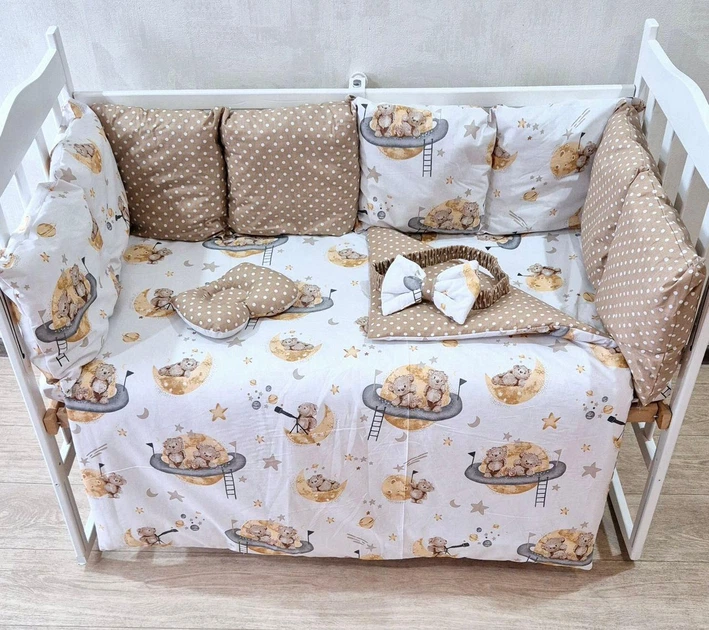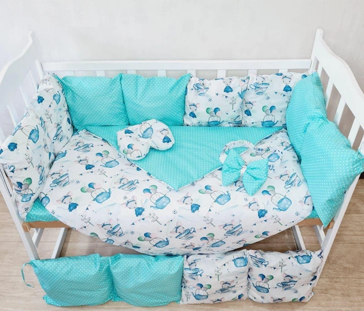 Комплект постільної білизни в ліжечко 120х60 см М'ятний + ведмедики, з бортиками на 4 сторони