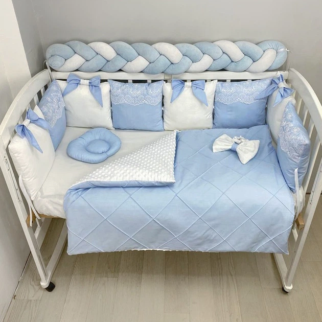 Комплект постільної білизни з ковдрою та бортиками на 4 боки ліжечка 120х60см-З Мереживом блакитний з косичкой