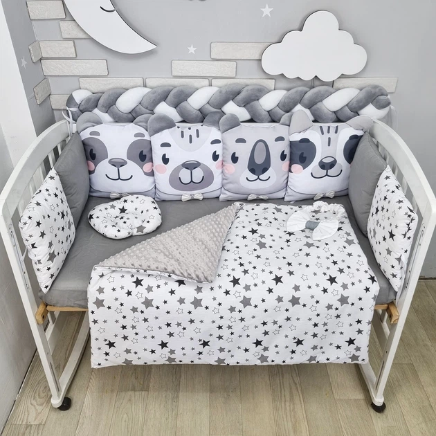 Комплект постільної білизни з ковдрою та 4 бортиками-іграшками на ліжечко 120х60см - Сірий в зірочку з косою