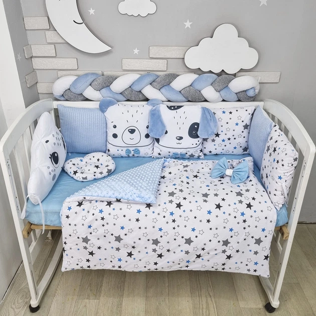 Комплект постільної білизни з ковдрою та бортиками-іграшками на 4 боки ліжечка 120х60см- Блакитний З косою