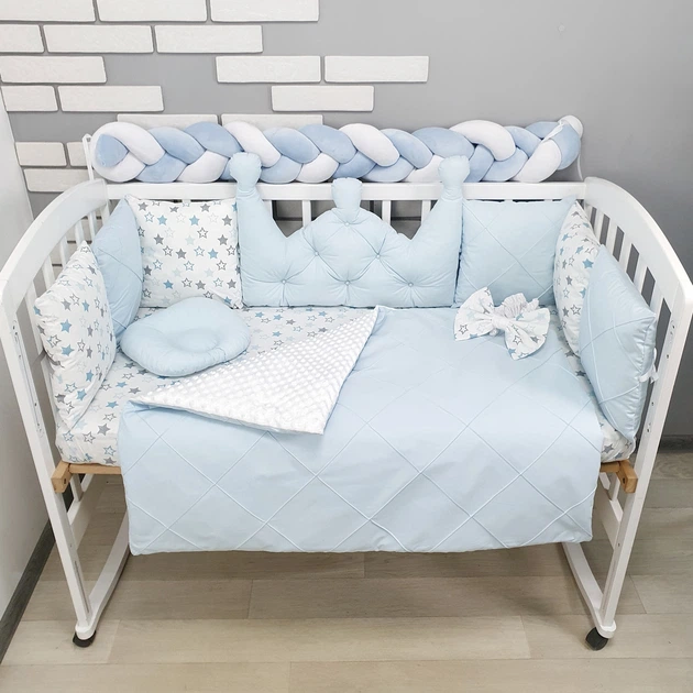 Комплект постільної білизни з ковдрою та бортиками на 4 боки ліжка 120х60см-Корона блакитна з стяжкою та косою