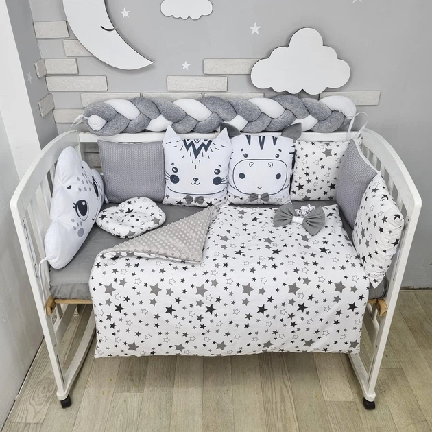 Комплект постільної білизни з ковдрою та бортиками-іграшками на 4 боки ліжечка 120х60см- Сіро-білий з косичкою