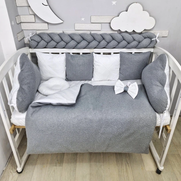 Комплект постільної білизни з ковдрою та бортиками на 4 боки ліжечка 120х60см - Сірий барашек з хмаринками та косою