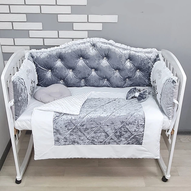 Комплект Преміум постільної білизни з ковдрою, бортиками з оксамиту зі стразами - Сірий - у ліжечко 120х60см