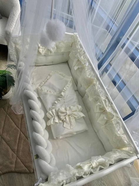 Комплект постільної білизни + бортик в дитяче ліжечко 120*60 см PremiumSweet молочний з мереживом