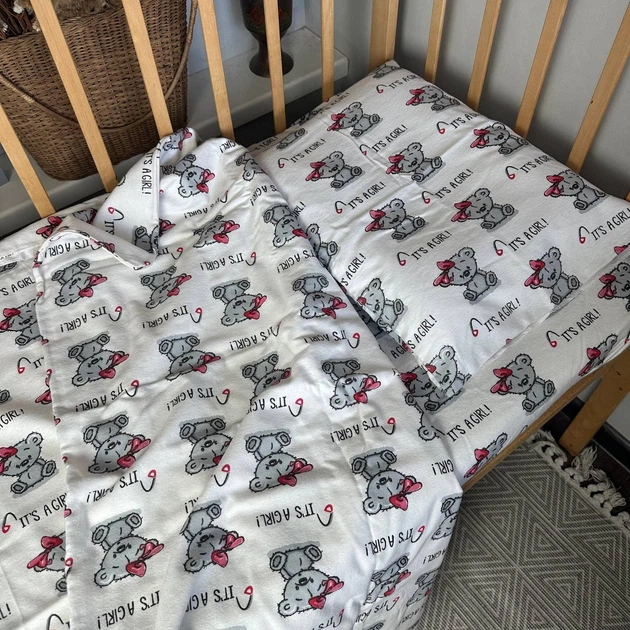 Байковий постільний набір у дитяче ліжечко 120Х60 см 3 предмети Ведмедики girl