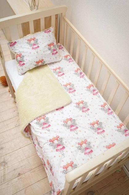 Теплий комплект у дитяче ліжечко з овчиною для малюків 2 предмети (ковдра, подушка) BST Білий з рожевим