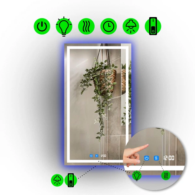 Прямокутне дзеркало з двома LED підсвітками 60 на 70 см, з двома сенсорами, годинником, механічним вимикачем та підігрівом,