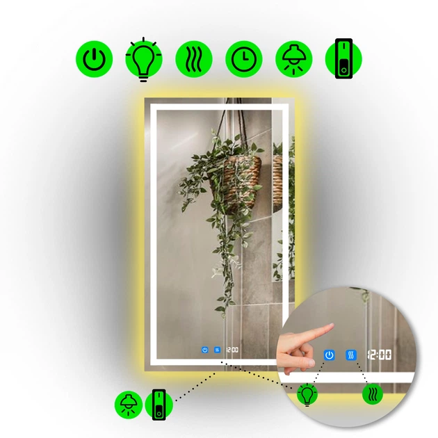 Прямокутне дзеркало з LED підсвіткою 80 на 100 см, з двома сенсорами, годинником та підігрівом, модель Karnet La Mir (karnet