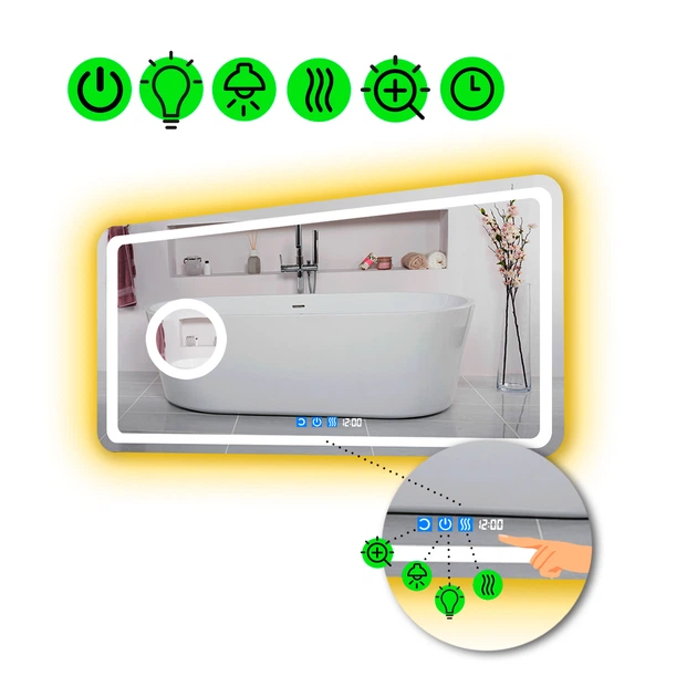 Прямокутне дзеркало з двома LED підсвітками 100 на 60 см, з двома сенсорами, годинником, механічним вимикачем та підігрівом,