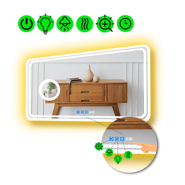 Закруглене дзеркало з LED підсвіткою 80 на 70 см, з трьома сенсорами, годинником, підігрівом та лінзою з підсвіткою, модель