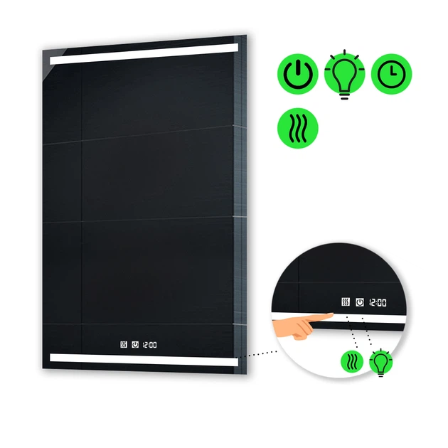 Прямокутне дзеркало з LED підсвіткою 70 на 80 см, з двома сенсорами, годинником та підігрівом, модель Anita La Mir (Anita50)