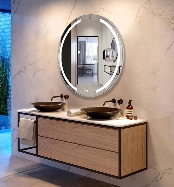 Закруглене дзеркало з LED підсвіткою 80 на 70 см, з двома сенсорами, годинником та підігрівом, модель Ahana La Mir (Ahanag50