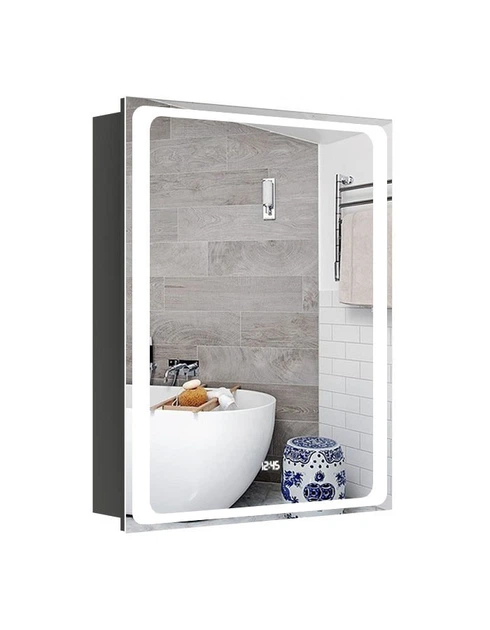 Прямокутне дзеркало з двома LED підсвітками 60 на 80 см, з двома сенсорними вимикачами, годинником та підігрівом, модель Mar