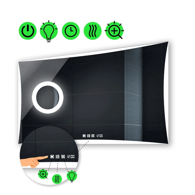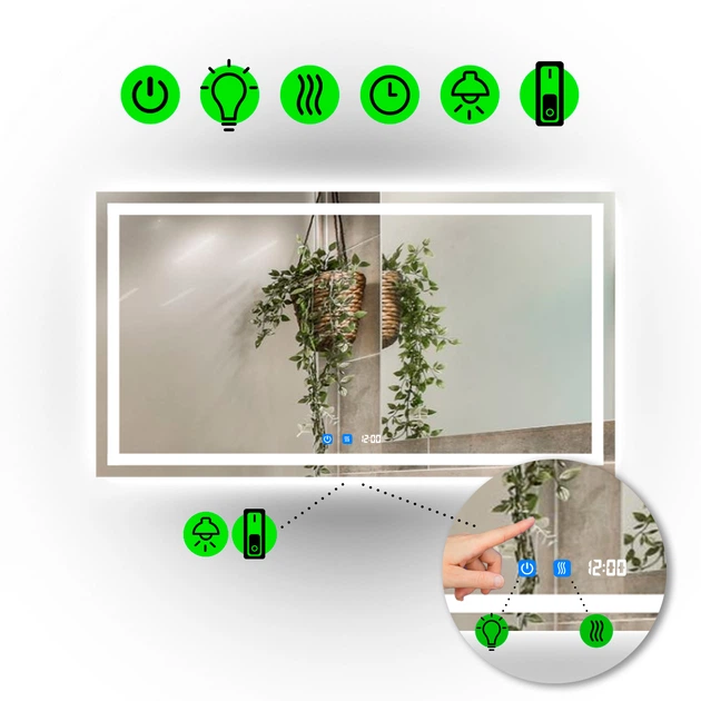 Прямокутне дзеркало з двома LED підсвітками 80 на 70 см, з двома сенсорами, годинником, механічним вимикачем та підігрівом,