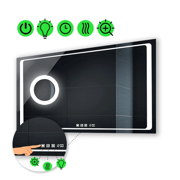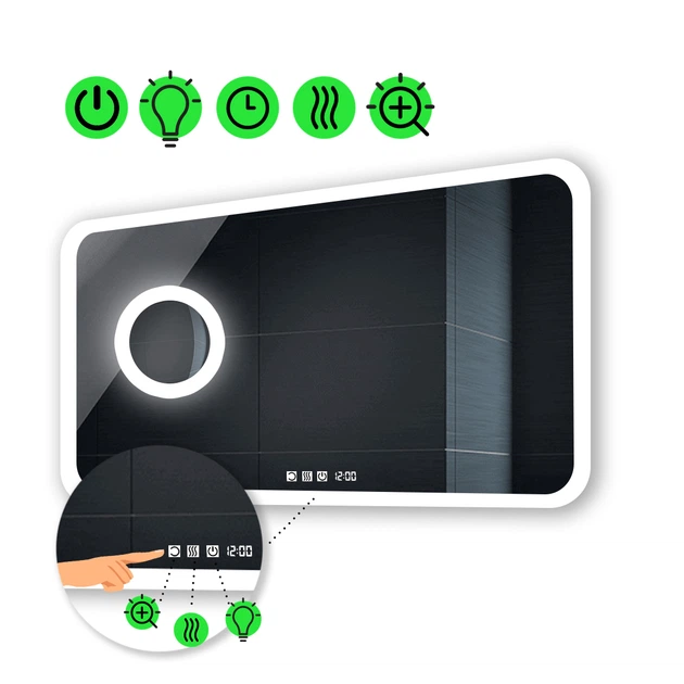 Прямокутне дзеркало з LED підсвіткою 80 на 70 см, з трьома сенсорами, годинником, підігрівом та лінзою з підсвіткою, модель