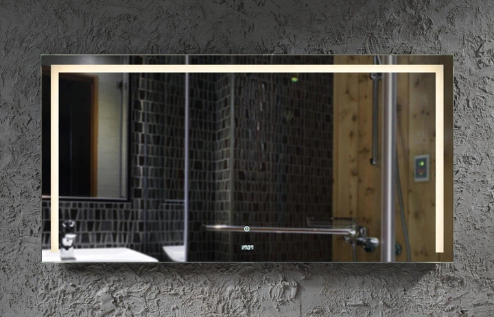Прямокутне дзеркало з двома LED підсвітками 60 на 100 см, з двома сенсорами, годинником, механічним вимикачем та підігрівом,