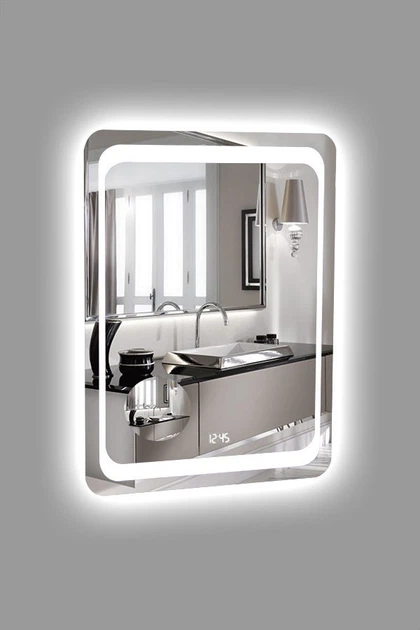 Прямокутне дзеркало з LED підсвіткою 100 на 60 см, з трьома сенсорами, годинником, підігрівом та лінзою з підсвіткою, модель