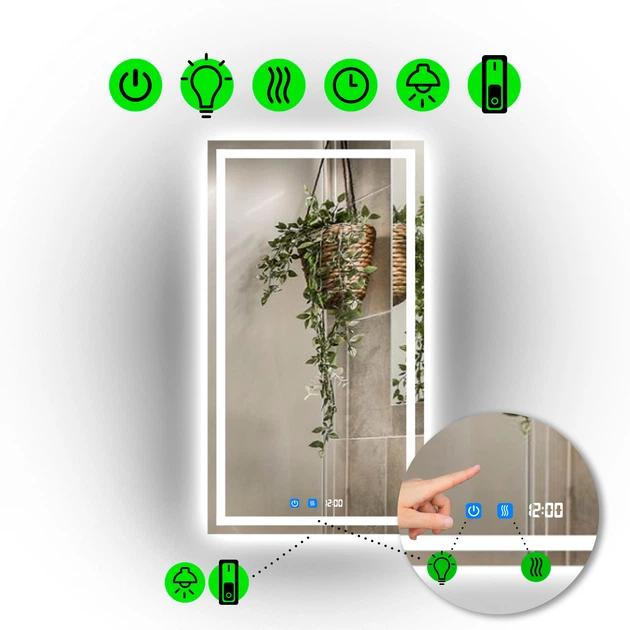 Прямокутне дзеркало з двома LED підсвітками 70 на 90 см, з двома сенсорами, годинником, механічним вимикачем та підігрівом,