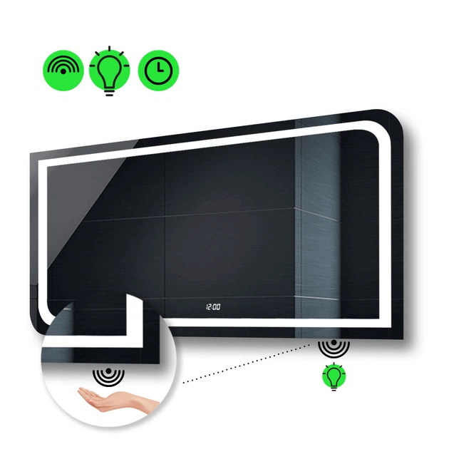 Закруглене дзеркало з двома LED підсвітками 100 на 60 см, з двома сенсорами, годинником, механічним вимикачем та підігрівом,