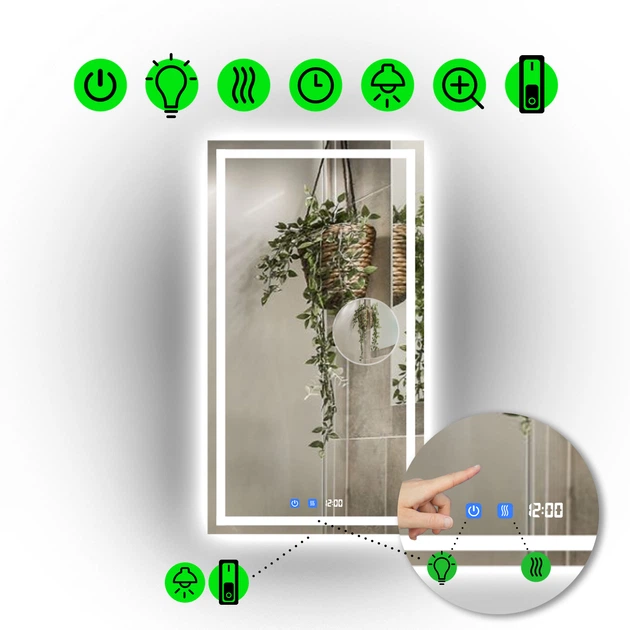 Прямокутне дзеркало з LED підсвіткою 90 на 80 см, з трьома сенсорами, годинником, підігрівом та лінзою з підсвіткою, модель