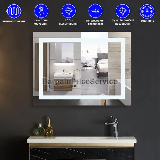 Прямокутне дзеркало з LED підсвіткою 80 на 70 см, з підігрівом та двома Механічними вимикачами, модель Lucia La Mir (luciag4
