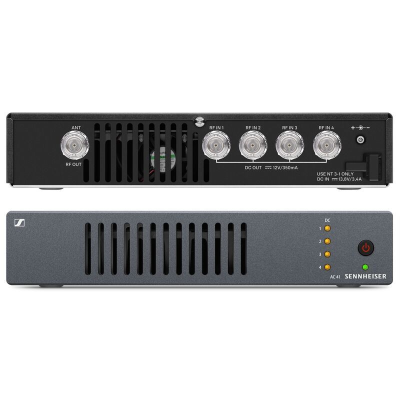 Активний антенний суматор Sennheiser AC 41-EU створений для роботи з мікрофонними системами серії evolution wireless G4. Він забезпечує підключення до чотирьох бездротових стереопередавачів, використовуючи лише одну спільну антену, що робить систему компактнішою та зручнішою в експлуатації. Живлення передавачів SR IEM G4 подається не через окремі блоки живлення, а від одного мережевого блоку NT 3-1,