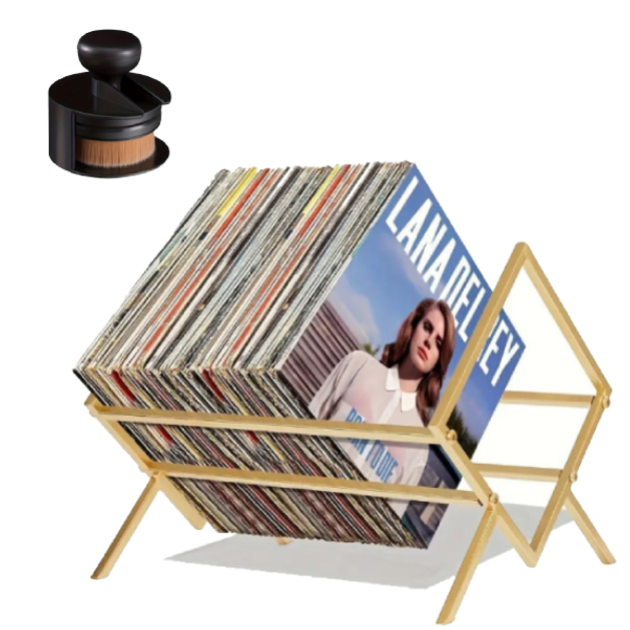 Стелаж підставка для зберігання вінілових пластинок та книг Gold + Антистатична щіточка для догляду за вініловими пластинкам