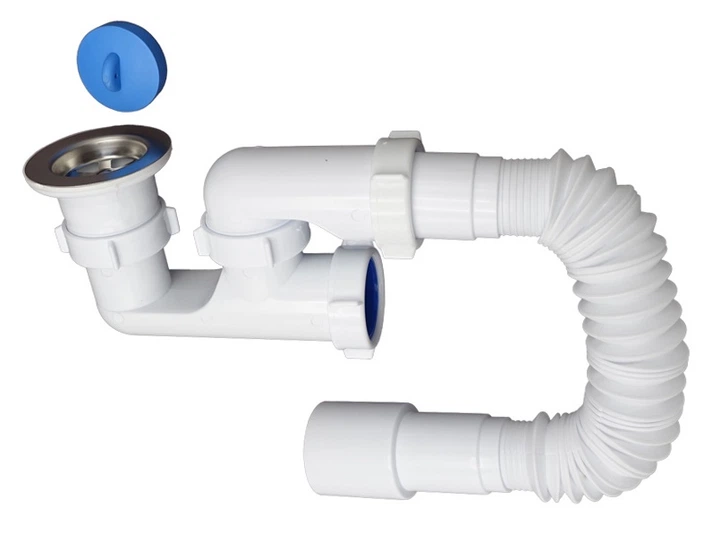 Сифон для кухонної мийки LK12 (60 08 E004 00) випуск 70 мм, колбовий з круглим переливом, з пробкою (вихід гофра 40/50 мм) L