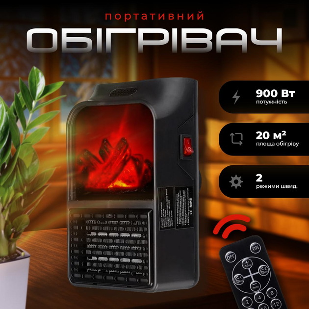 Портативний обігрівач FLAME HEATER 900 Вт з імітацією каміна тепловентилятор з пультом і регулюванням температури (D-2019090