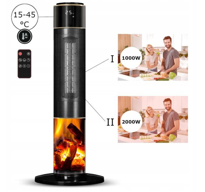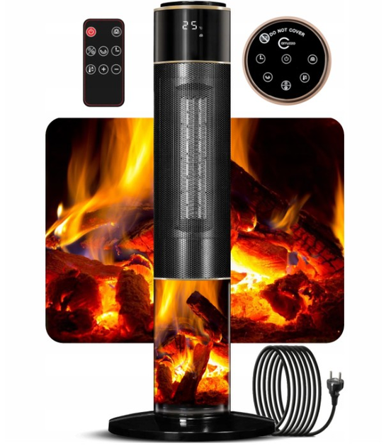 Колонний керамічний тепловентилятор Carruzzo DM-PTC-2071L 2000 Вт з пультом дистанційного керування з імітацією каміна Чорни