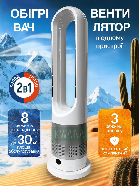 Підлоговий вентилятор-обігрівач 2в1, тихий бездротовий кулер колонний з пультом, зима-літо, автоповорот, 1200 Вт, 67 см біли