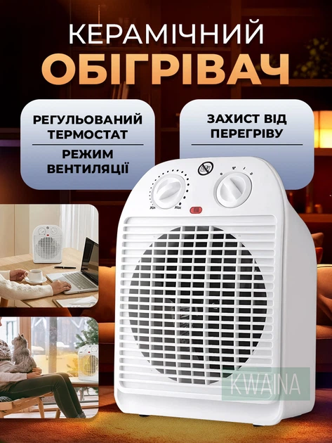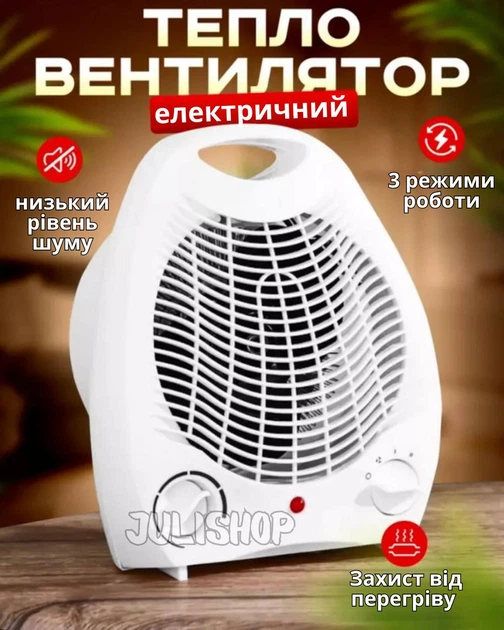 Електричний тепловентилятор 2000 Вт, побутовий обігрівач 2 режими нагріву, компактний для дому, офісу та дачі (білий)