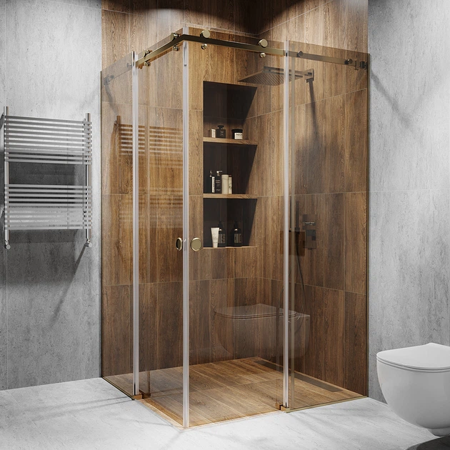 Кутова розсувна душова кабіна з двома дверима 2000 мм, Бронза, Інтим зона, Gold - Золото поліроване, 950 мм