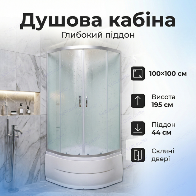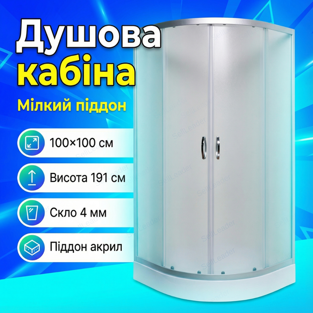 Душова кабіна Vivia 100x100x191см кутова чверть кола розсувні двері акриловий низький піддон для ванної