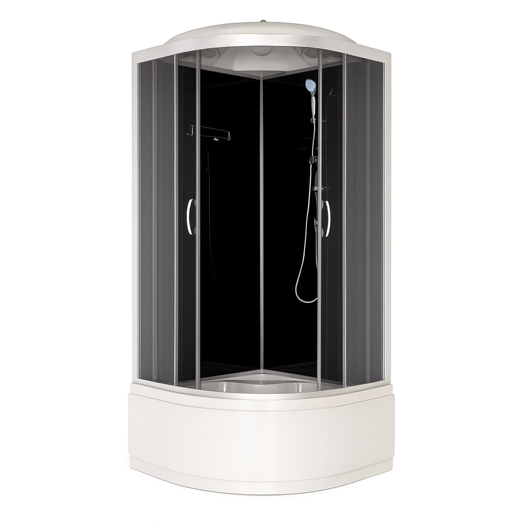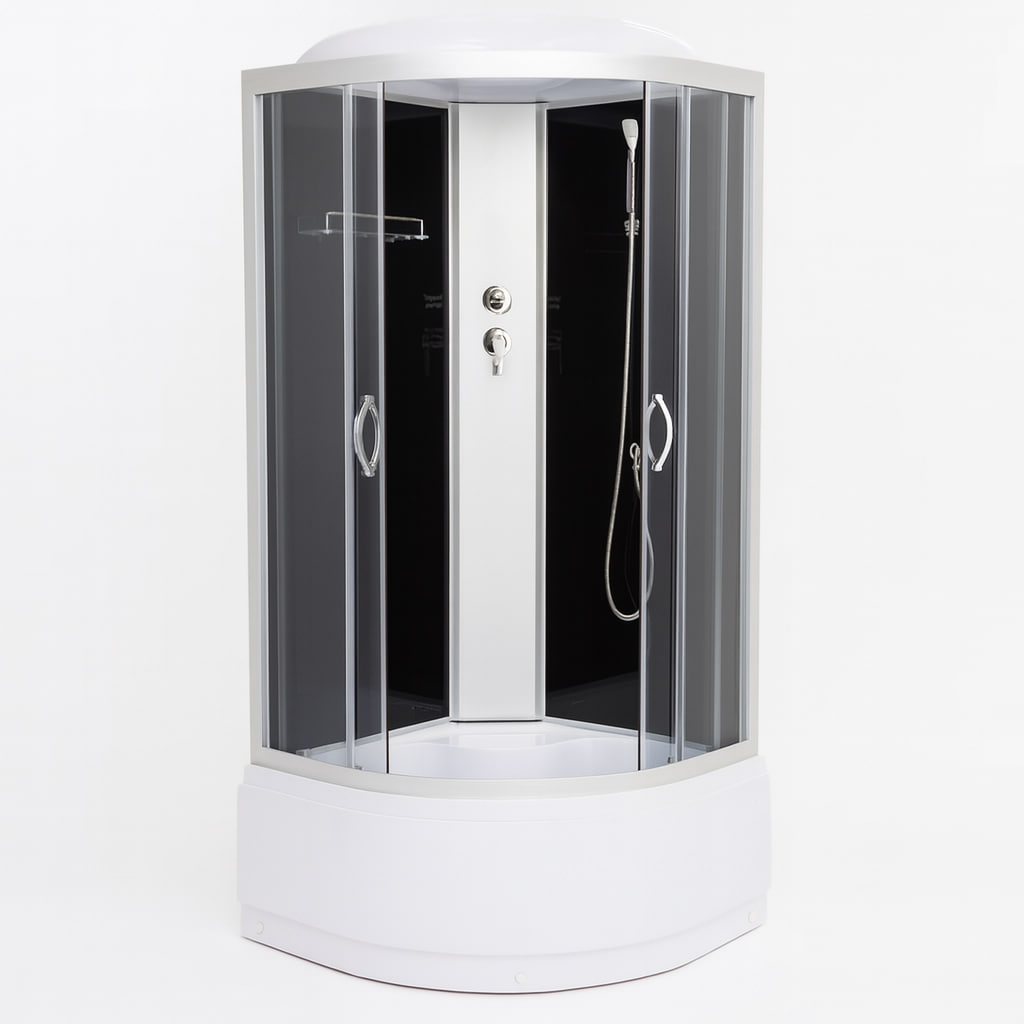 Гідробокс VIVIA - виконаний з якісних матеріалів, які використовуються для сантехнічних виробів. Гідробокс (Vivia) - ідеальне рішення для ванних кімнат невеликих розмірів. Душовий бокс напівкруглої форми, колір переднього скла - сірий, заднього - чорний. Скло удароміцне та загартоване в сірому тонованому відтінку. У комплекті йде ручна лійка із зручним тримачем та кількома режимами