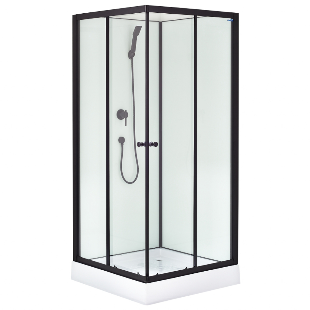 Інформація про розміри: Розміри кабіни вказані по піддону. Фактичні можуть відрізнятися на 2-3 см.; Форма: Квадратна; Гарантія: 24 місяці; Глибина піддону, см: 5; Колір профілю: Чорний; Матеріал профілю: Алюміній; Піддон: У комплекті; Ролики: Подвійні верхні та одинарні нижні ролики; Ширина, см: 80; Товщина скла, см: 0.4; Тип піддону: Мілкий; Тип скла: Прозоре; Тип відкриття дверей: Роз'їздні; Висота піддону, см: 15