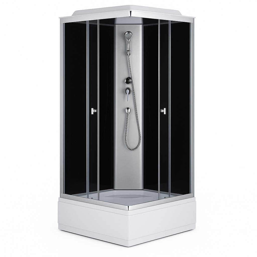 Душовий бокс KO&PO 175 G 90х90х215 см на середньому піддоні сатин прозоре скло розсувні двері Якщо Ви шукаєте стильний, зручний і недорогий душовий гідробокс з максимумом комфорту — модель KO&PO 175 G 90 саме для Вас. З оптимальними розмірами 90×90 см він дозволяє вільно розташуватися людині середньої комплекції, а піддон середньої висоти дає змогу користуватися виробом навіть літнім людям.