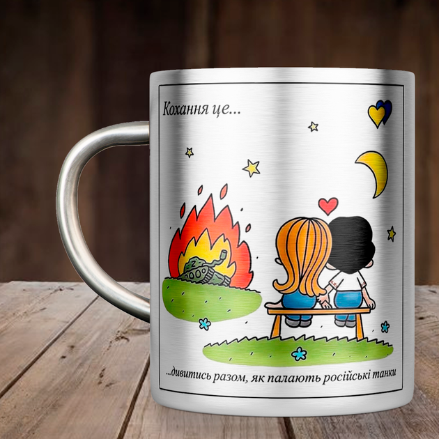 Чашка Кохання це… дивитись разом як палають російські танки металева 300 мл срібляста