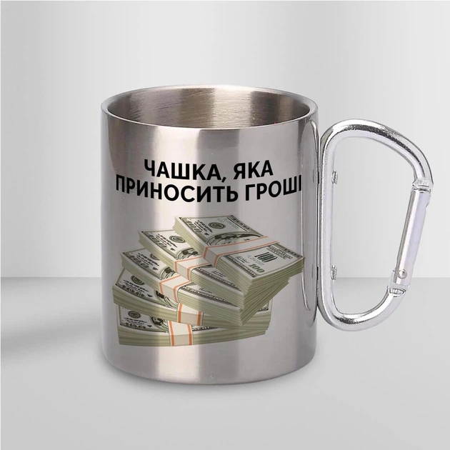 Подарункова кружка сталева з надписом "Чашка яка приносить гроші" 300 мл срібна з карабіном для кави чаю в подарунок туристи