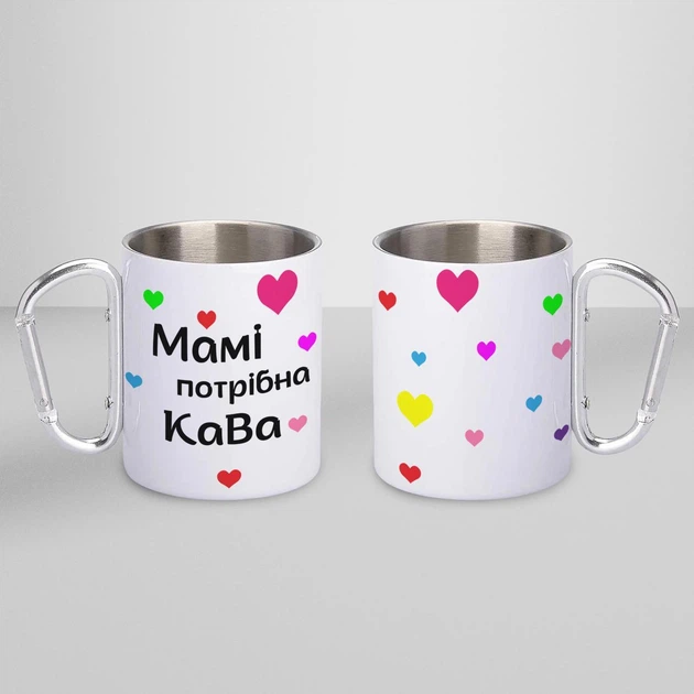 Подарункова чашка металева з принтом "Мамі потрібна кава" для напоїв 300 мл біла з карабіном для матусі