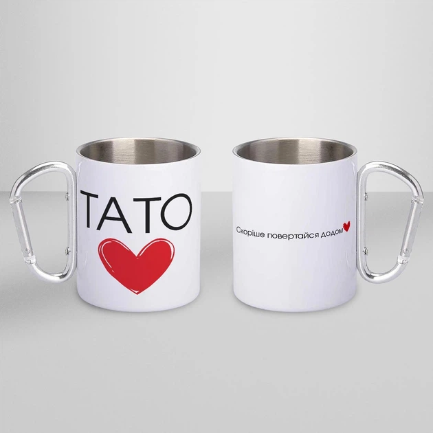 Подарункова чашка сталева з принтом "Тато скоріше повертаися" для напоїв 300 мл біла з карабіном