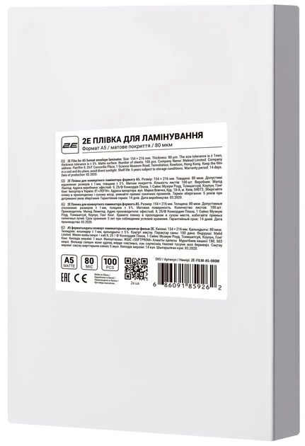 Плівка для ламінування A5 2E, матове покриття, 80 мкм, 100шт
