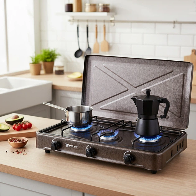 Настільна газова плита 3 конфорки YUCEL для кухні та дачі економічна потужна із захисною кришкою