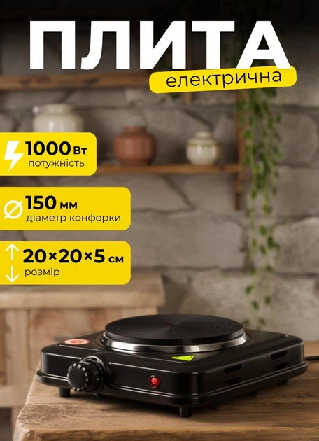 Електрична плита настільна SOKANY SK-5109 електроплита на 1 конфорку 1000 Вт дискова 20х20х5 см Чорний