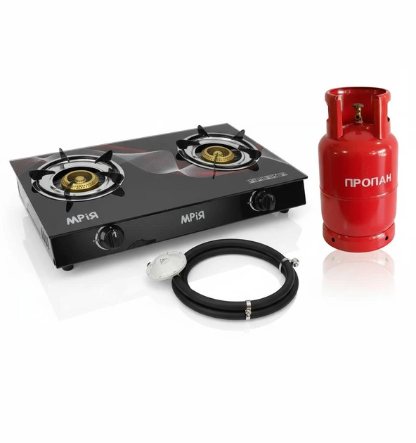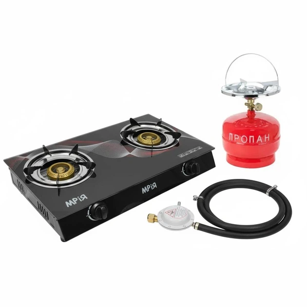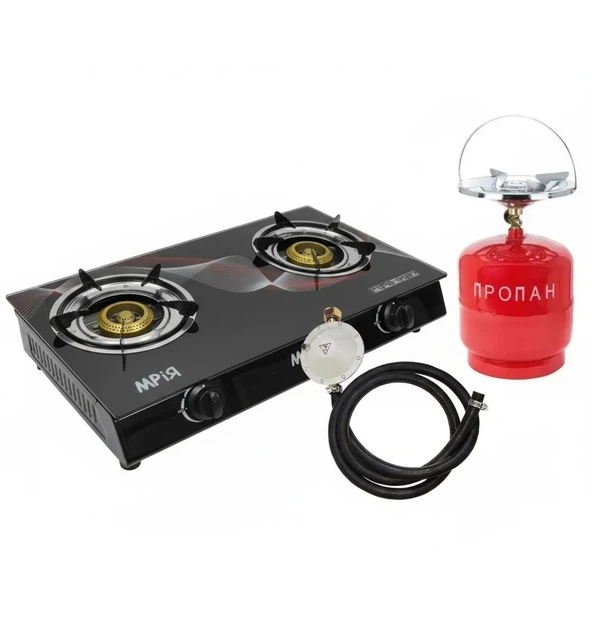 Плита-таганок настільна газова Мрія 2 Скло з балоном 12 л ( підключення 3м шланга, редуктор, хомути)